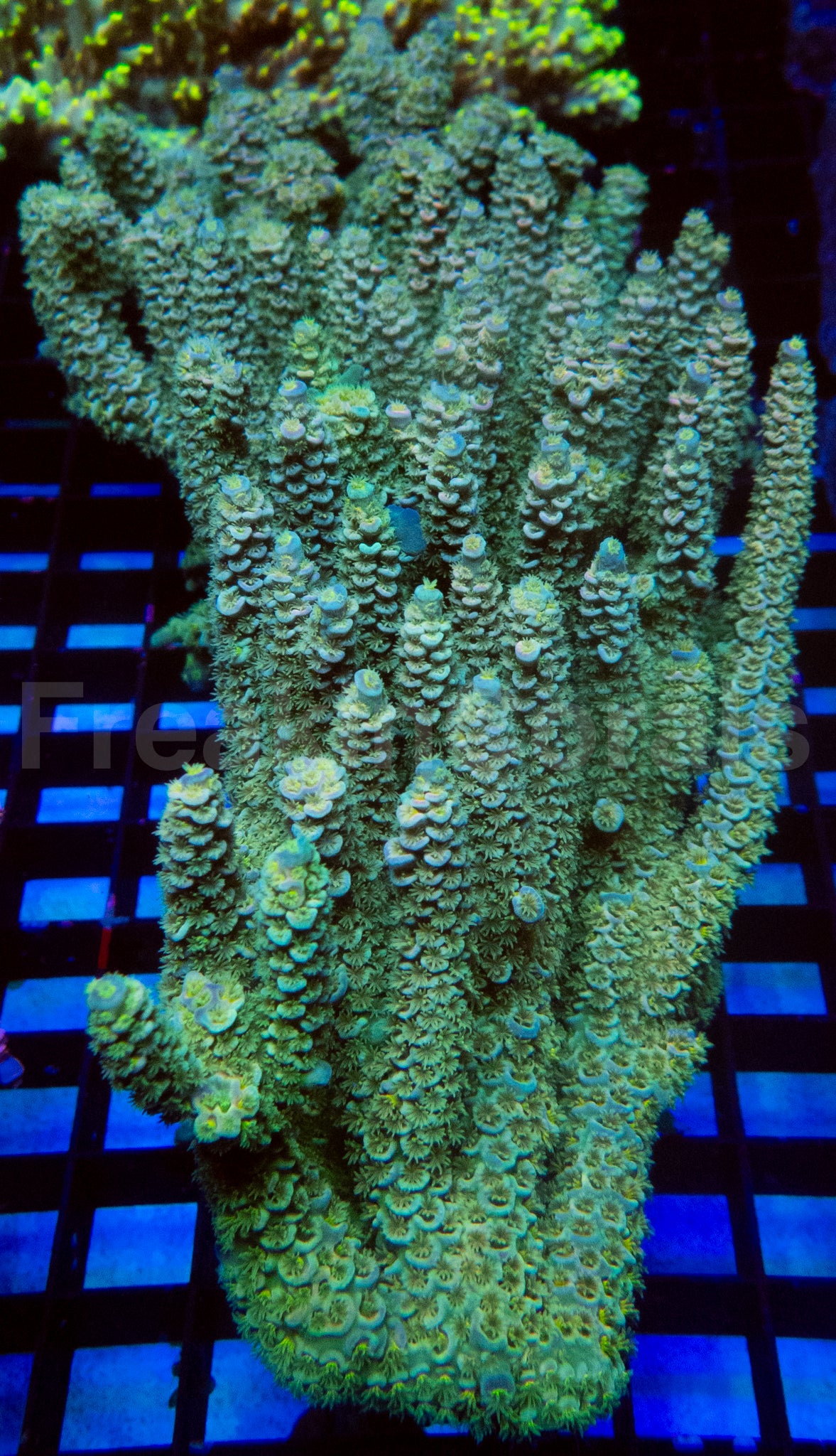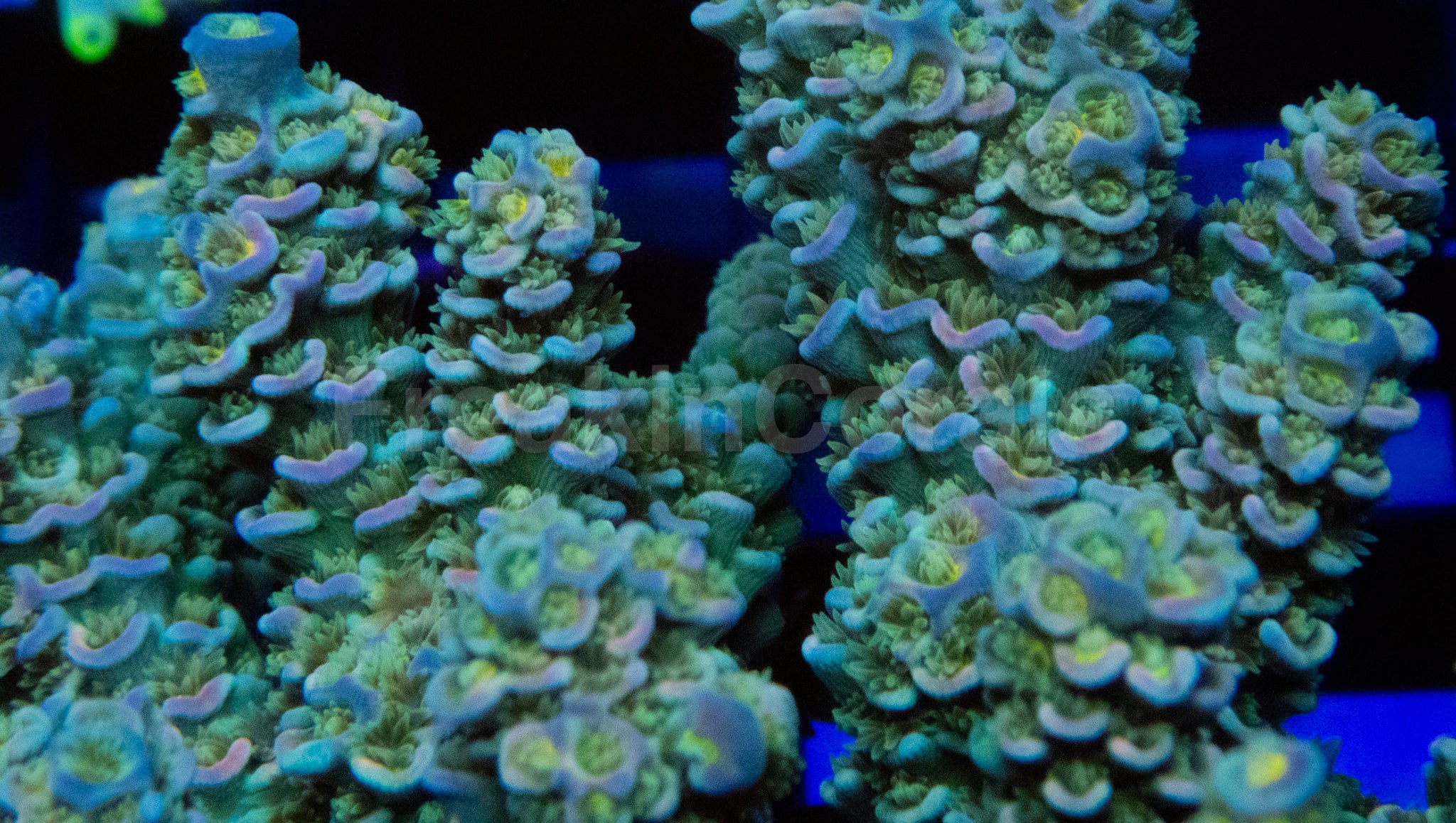 Neon green base. Electric blue tips. Big, fluffy polyps.