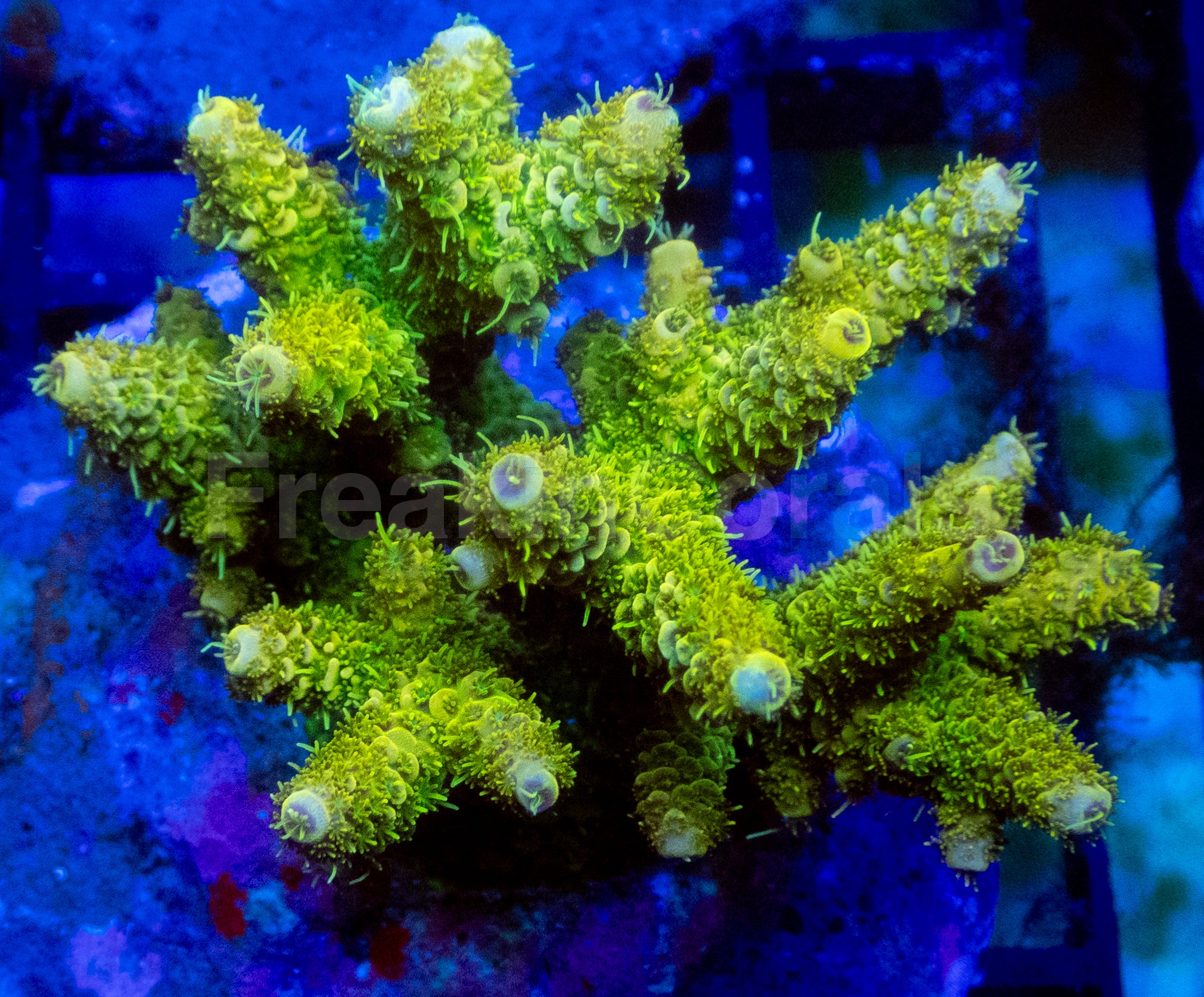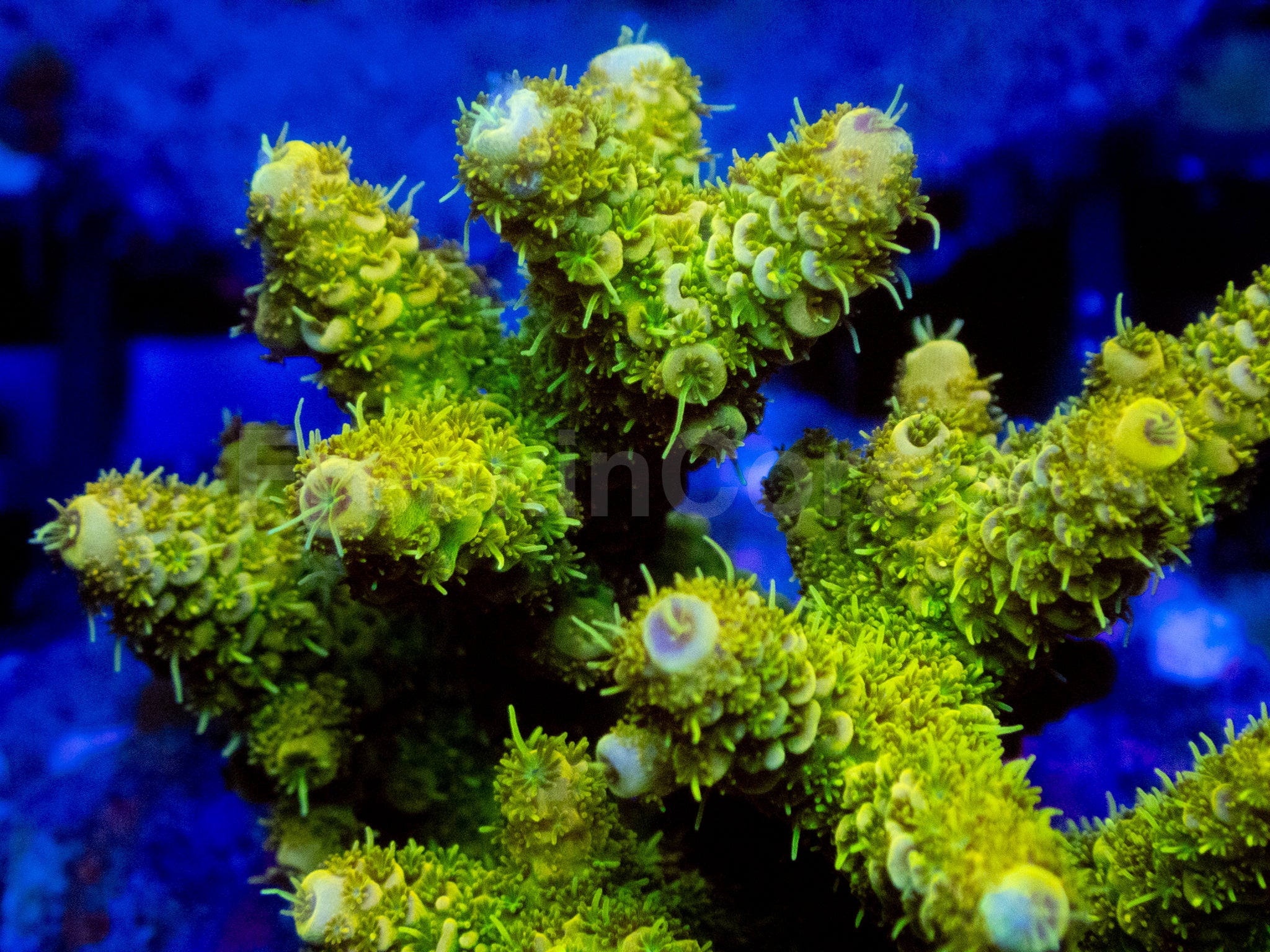 Colour Form: A stunning pure yellow to soft golden body with gentle cream and lime undertones. The branches glow like liquid sunlight, with each polyp radiating under actinic or blue lighting. Under white light the coral displays warm, natural golden hues; under reef blues it becomes a soft neon beacon β€” clean, luminous, and full of life.