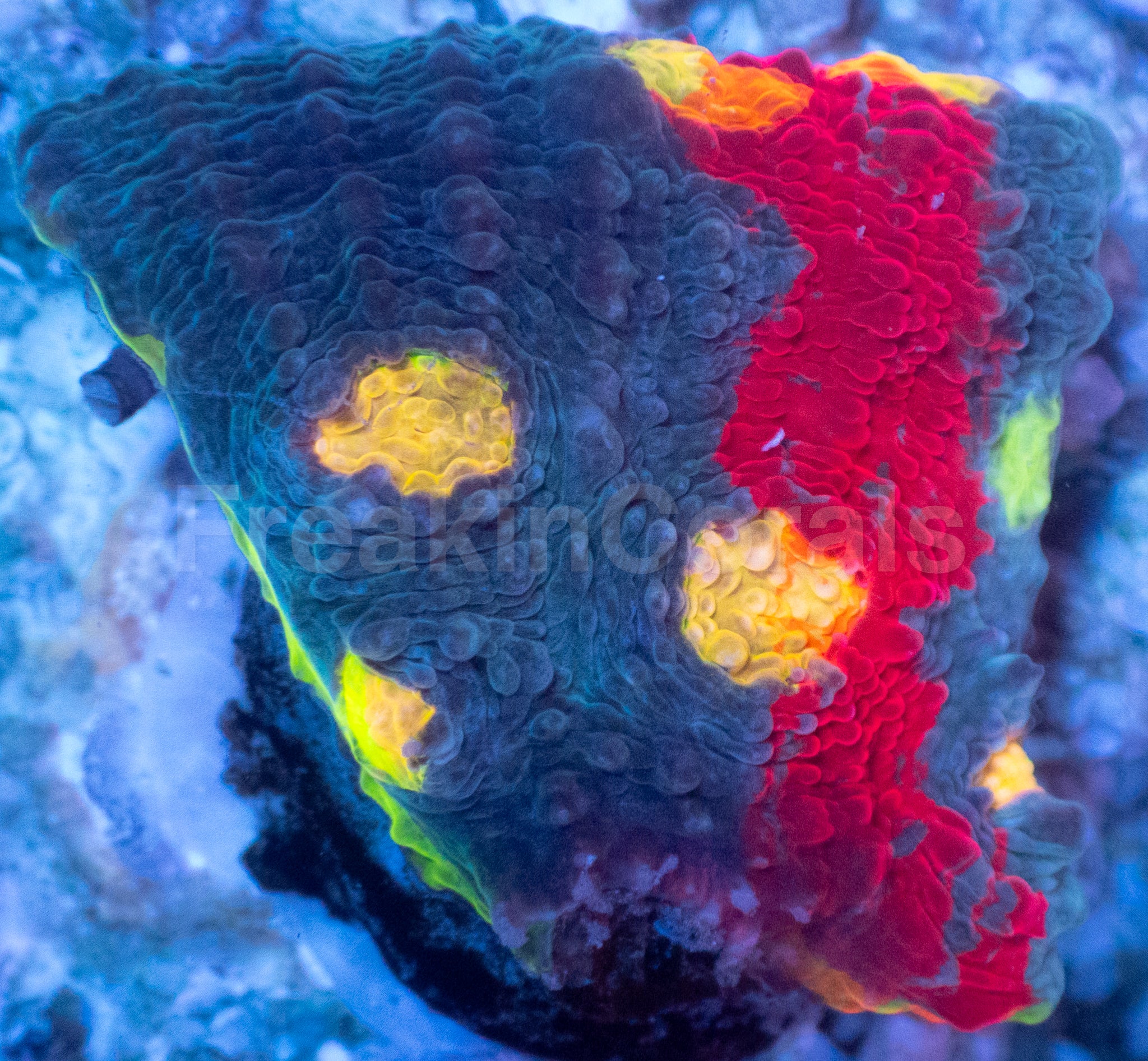 The Bugatti Rainbow Chalice (Colony) is a breathtaking WYSIWYG coral, displaying a kaleidoscope of reds, greens, blues, and purples. Its vivid multi-colouration and dynamic surface texture make it a true centrepiece for any reef aquarium.