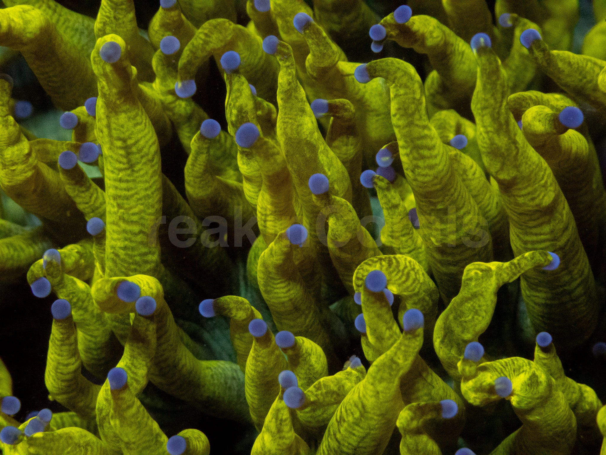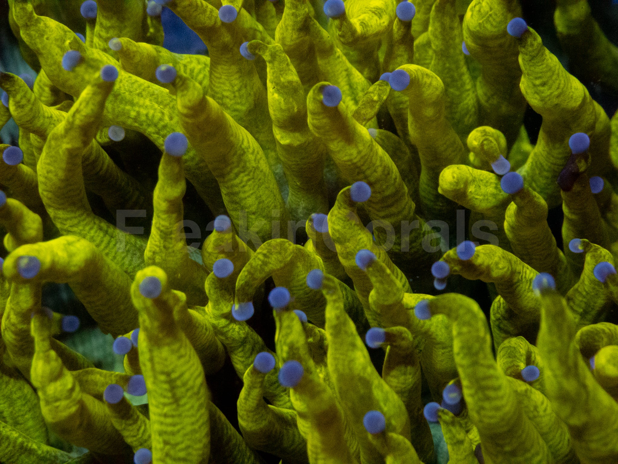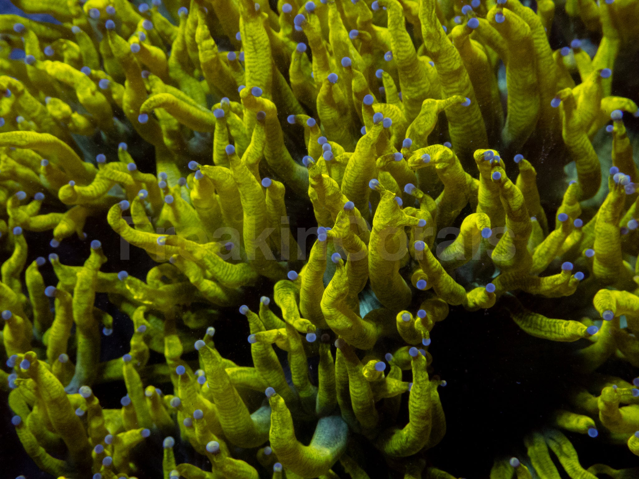 Colour Form: The “Chernobyl Ultra Toxic Yellow” morph is an extraordinary, collector-grade Elegance Coral featuring intensely fluorescent toxic-yellow tentacles tipped with subtle lime and gold reflections and a glowing aqua-green oral disc.