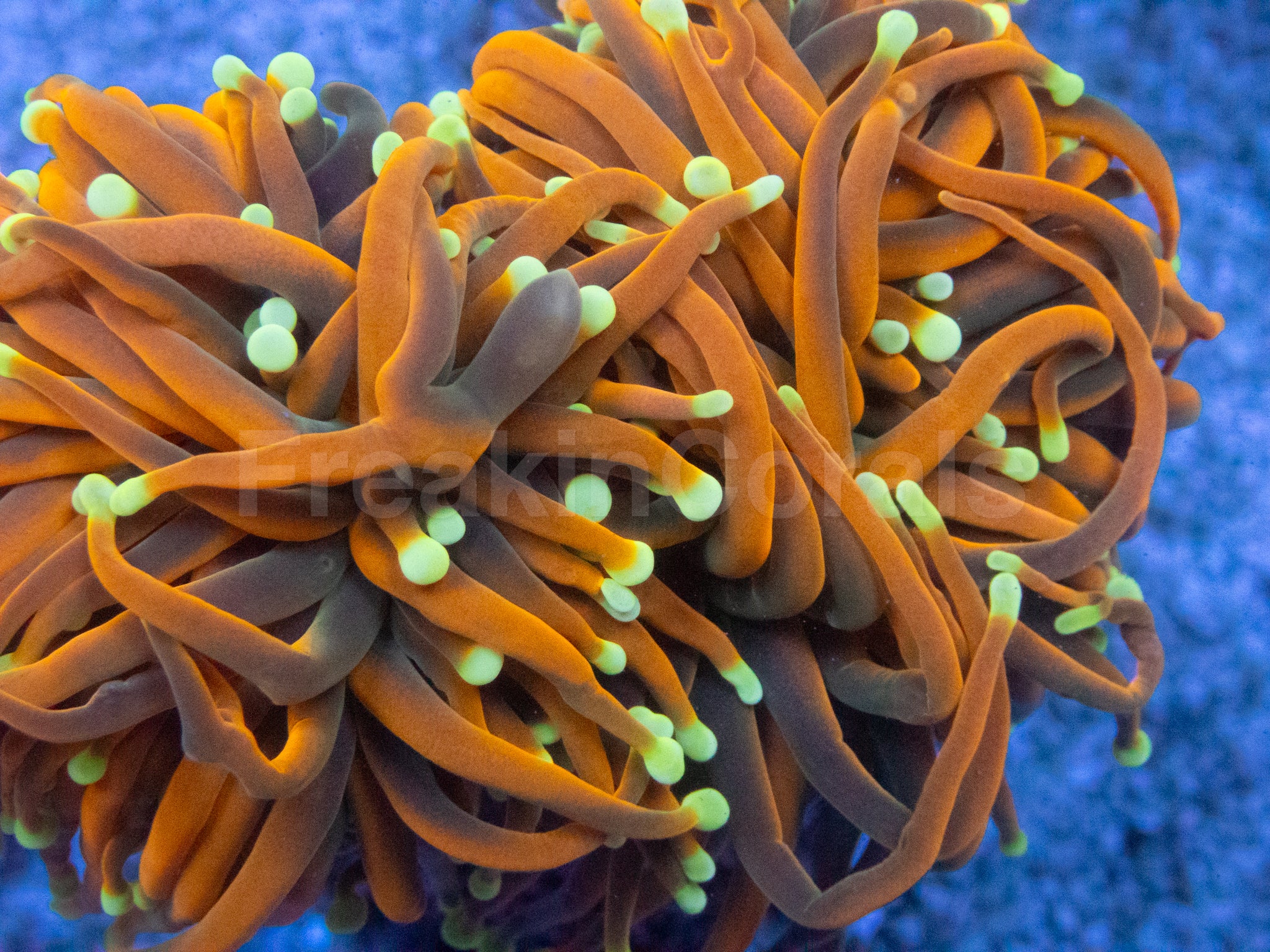 Because of its rare true orange coloration and strong fluorescence, this coral is considered a high-end collector Euphyllia morph and a true centerpiece coral in any reef system.
