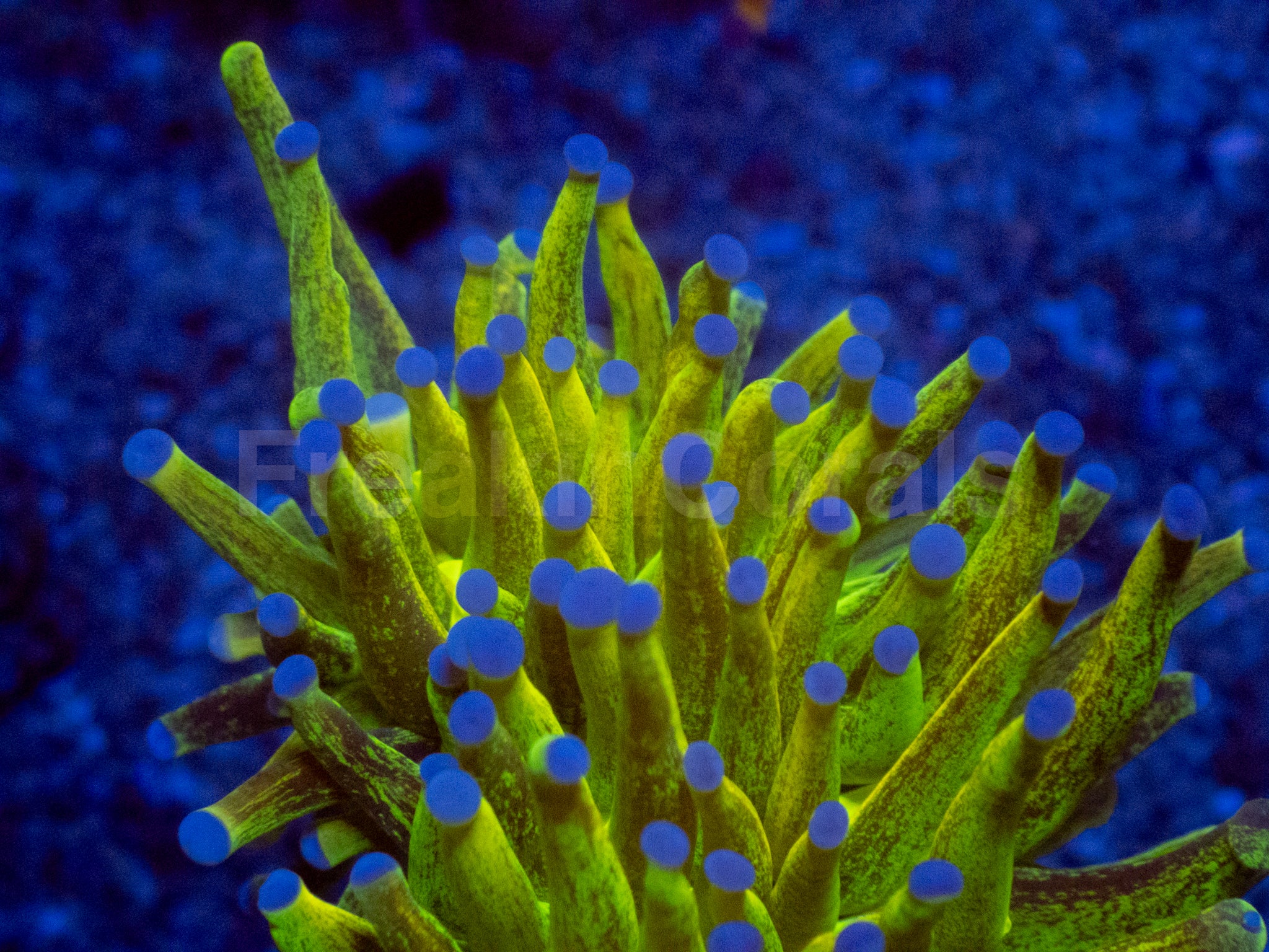 Colour Form: An extraordinary fluorescent green torch with electric blue tips and unique leopard-like speckles across the tentacles — a mesmerizing blend of pattern and luminescence found only in this FreakinCorals exclusive. Under blue spectrum lighting, it emits a hypnotic bioluminescent glow, shifting from emerald green to sapphire blue with every sway of its tentacles.