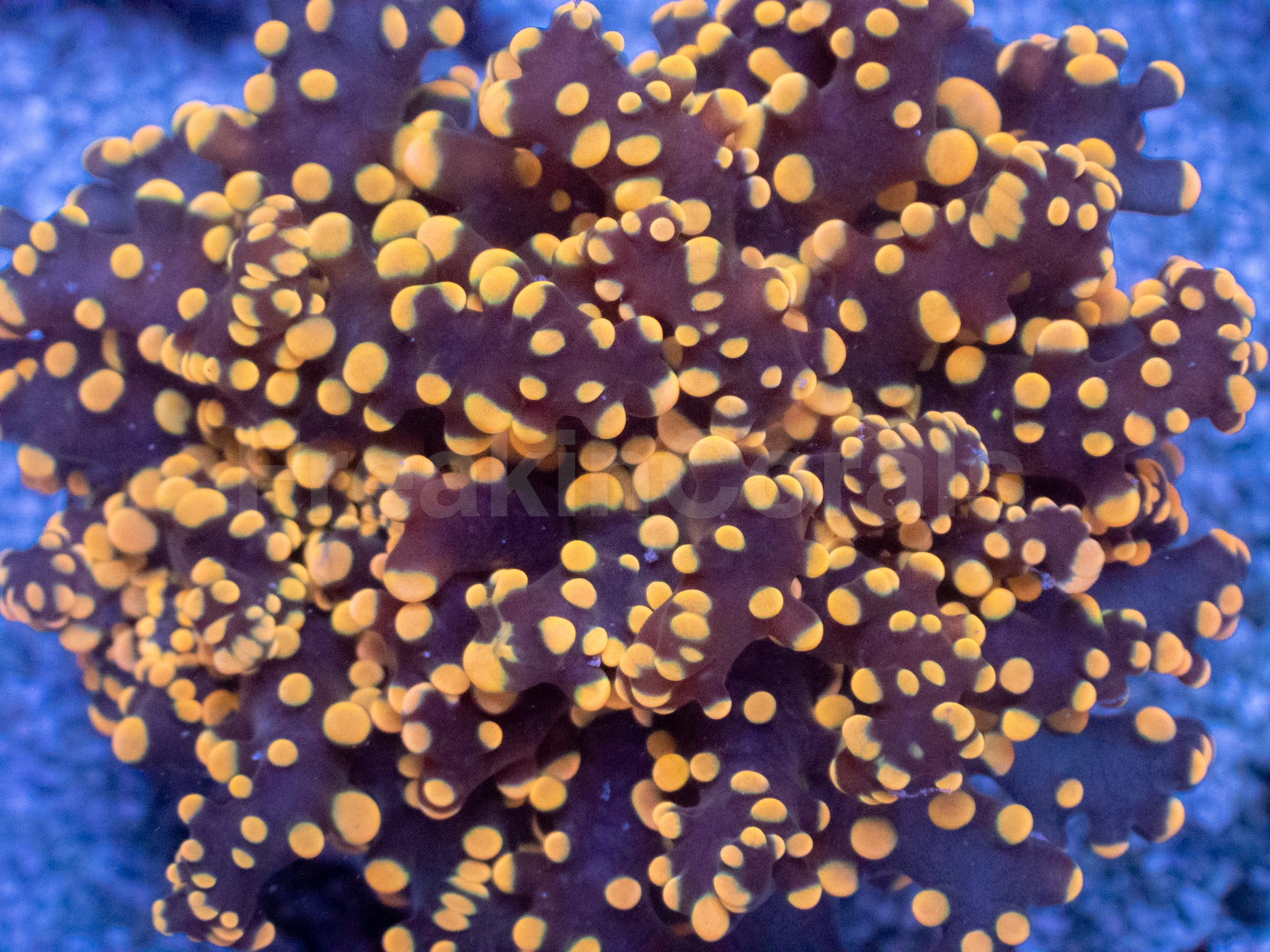 Colour Form: A breathtaking orange yamamensis displaying intense molten-orange tentacles with shimmering golden tips. Under actinic and hybrid lighting, the coral radiates fiery tones reminiscent of flowing lava โ€” one of the most vivid torch morphs available.