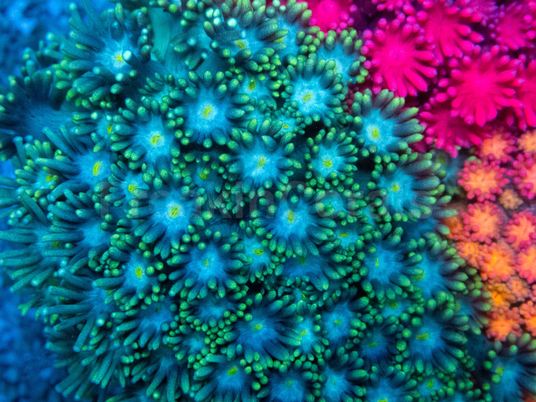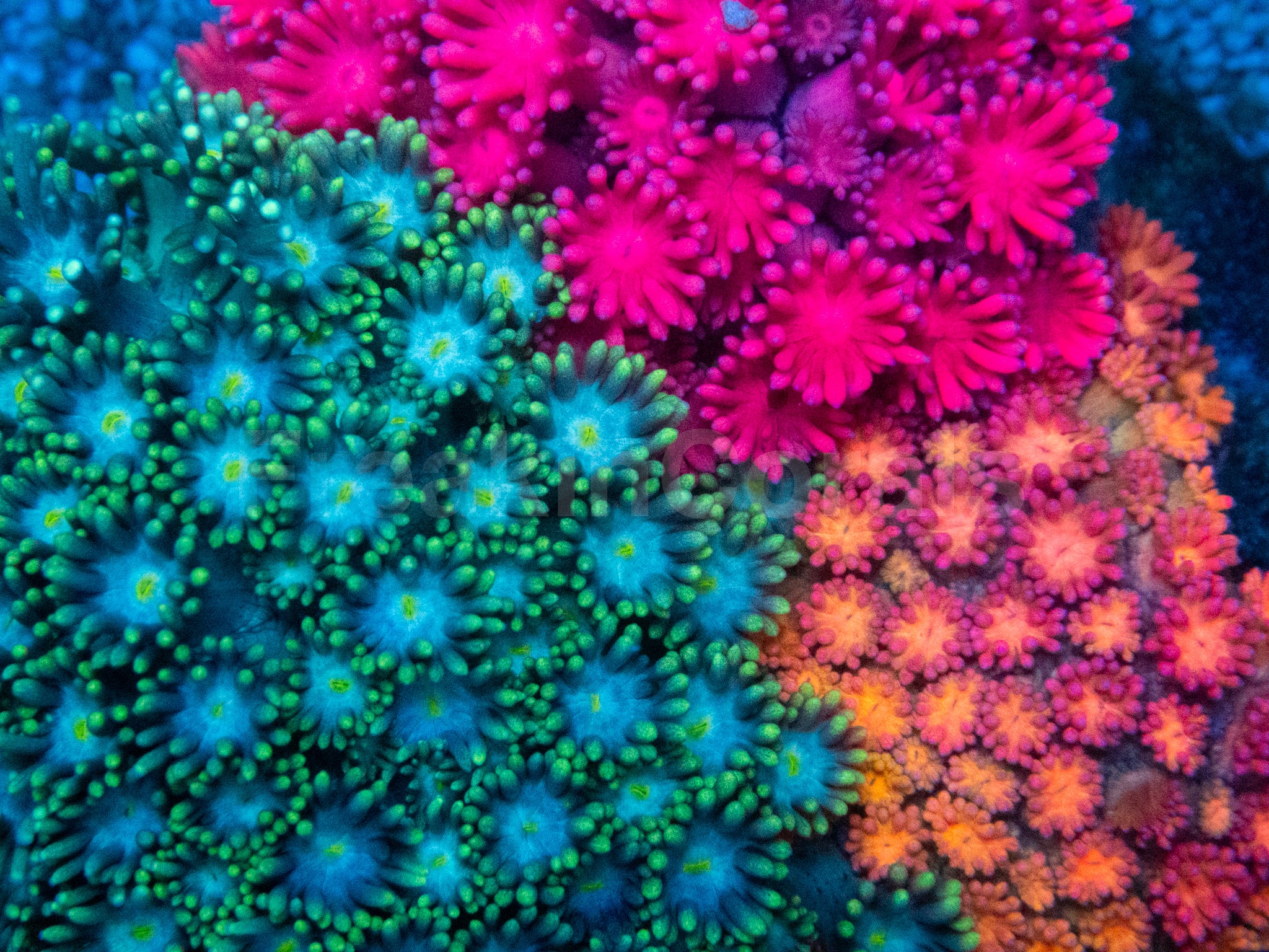 Three elite Goniopora morphs. One perfectly balanced rainbow composition.