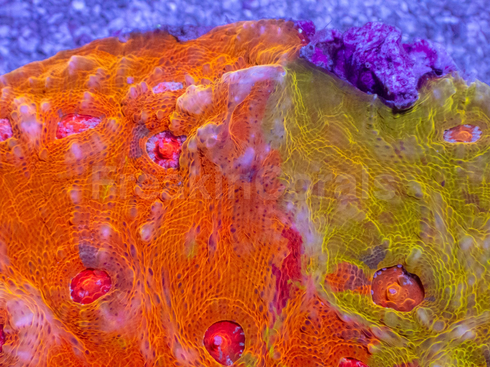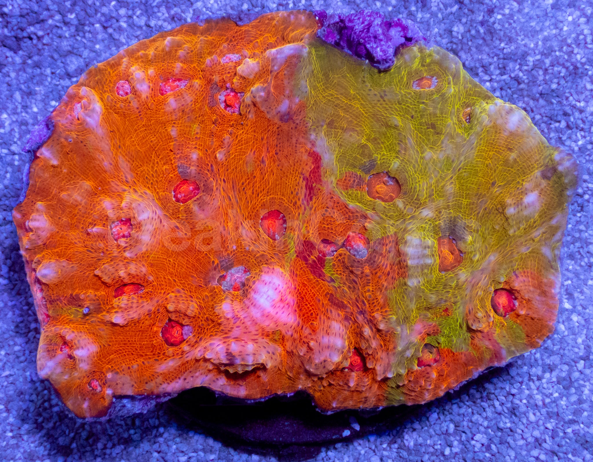 Its orange-and-gold fusion creates an effect reminiscent of molten sunlight captured in coral form, making it an unforgettable centrepiece for any LPS or mixed reef.