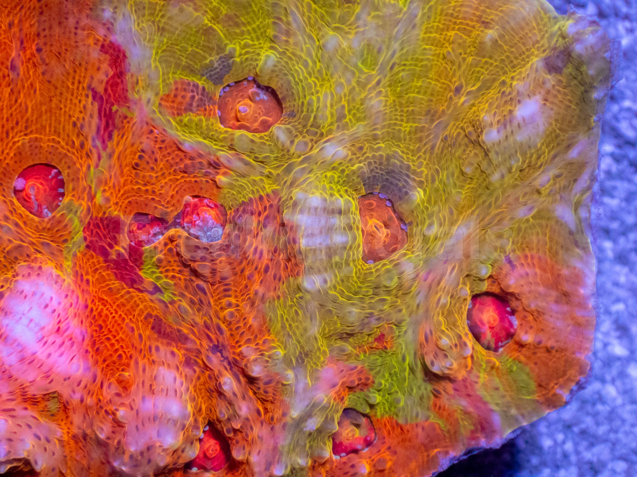 While photosynthetic, Echinophyllia thrives with supplemental feeding 1–2 times per week. Offer Reef Roids, Coral Dust, or finely minced Mysis for optimal tissue expansion and colour depth. Maintain stable trace elements (manganese, iron, and potassium) for enhanced fluorescence and skeletal growth.
