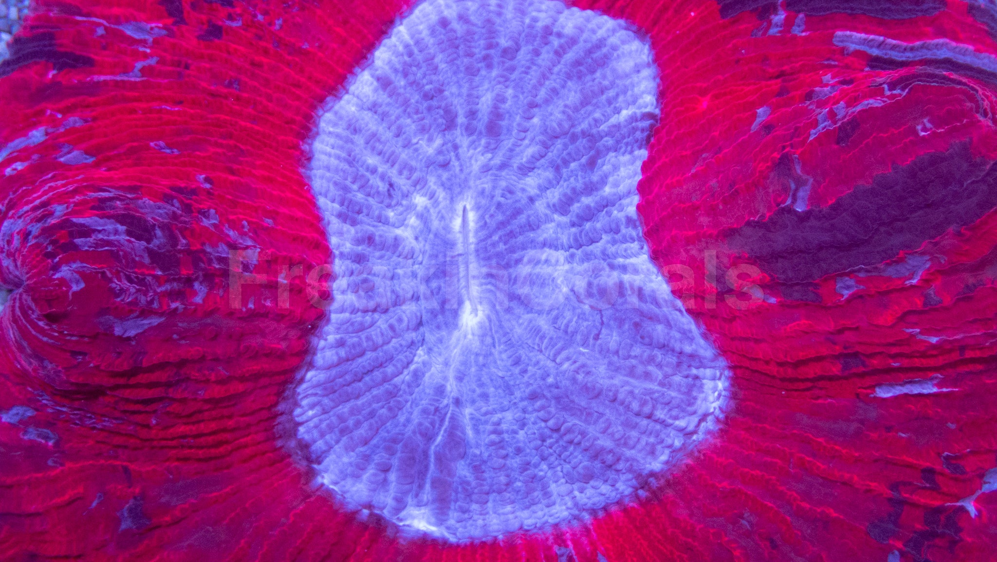 Colour Form: Warpaint Trinity is a high-end Trachyphyllia displaying an explosive combination of deep red, electric blue and rich purple striping radiating across the disc in a bold “warpaint” pattern. The colours are layered, saturated and highly contrasted, creating a dynamic, aggressive visual effect. Under blue lighting, the blues and purples fluoresce intensely while the reds deepen, giving the coral a powerful, almost painted-on appearance.