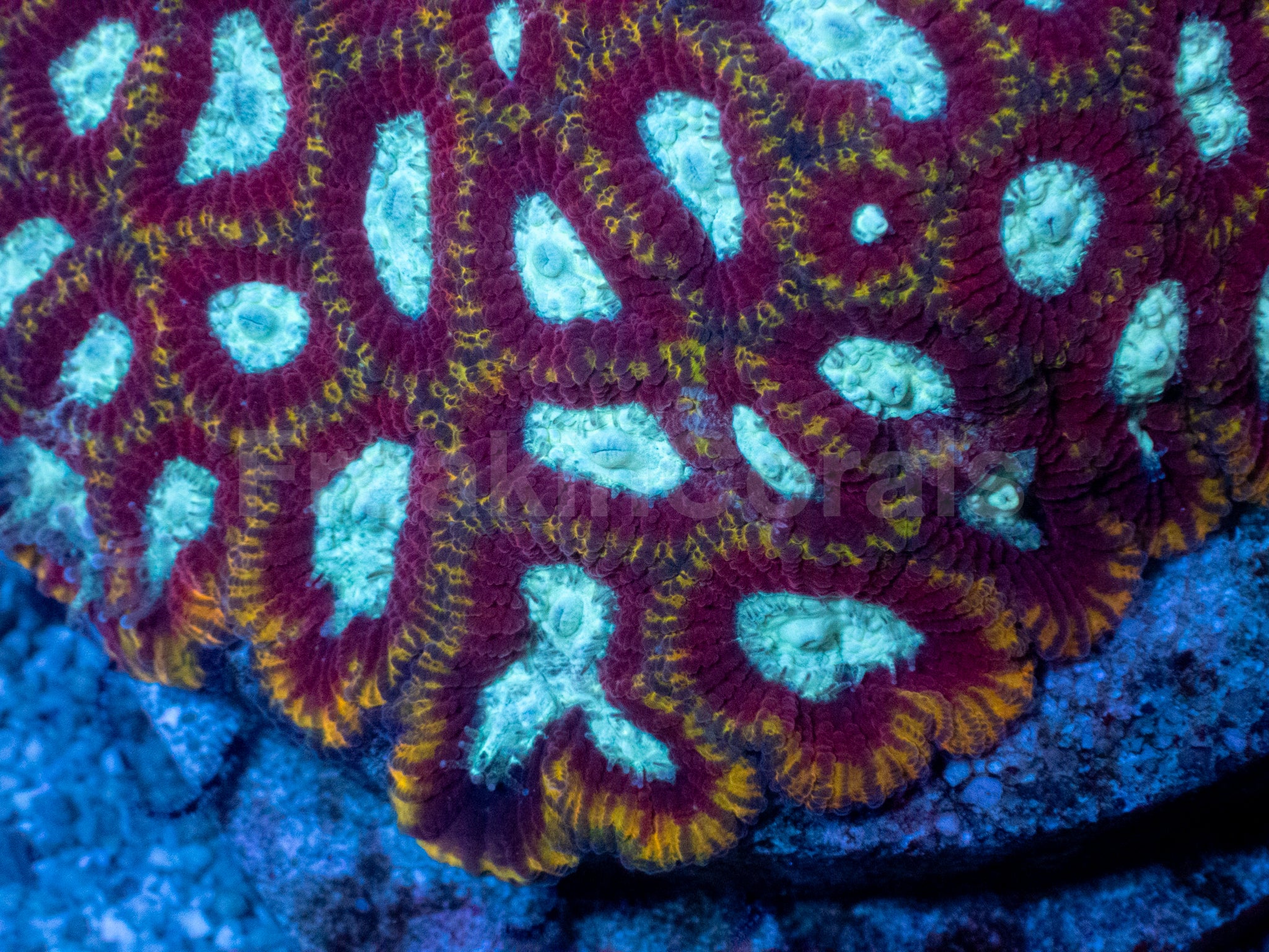 The Ultron Favia is a rare, high-contrast morph prized for its three-colour separation and intense fluorescence. Propagated directly from our in-store mother colony, each frag offers: