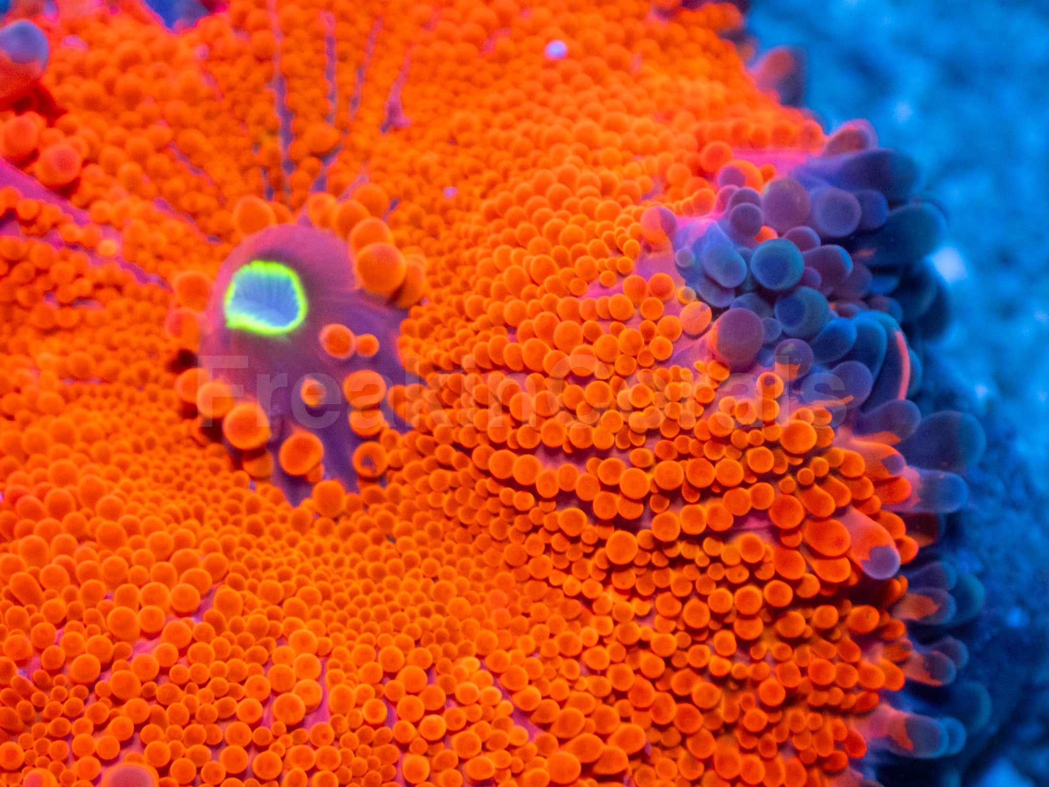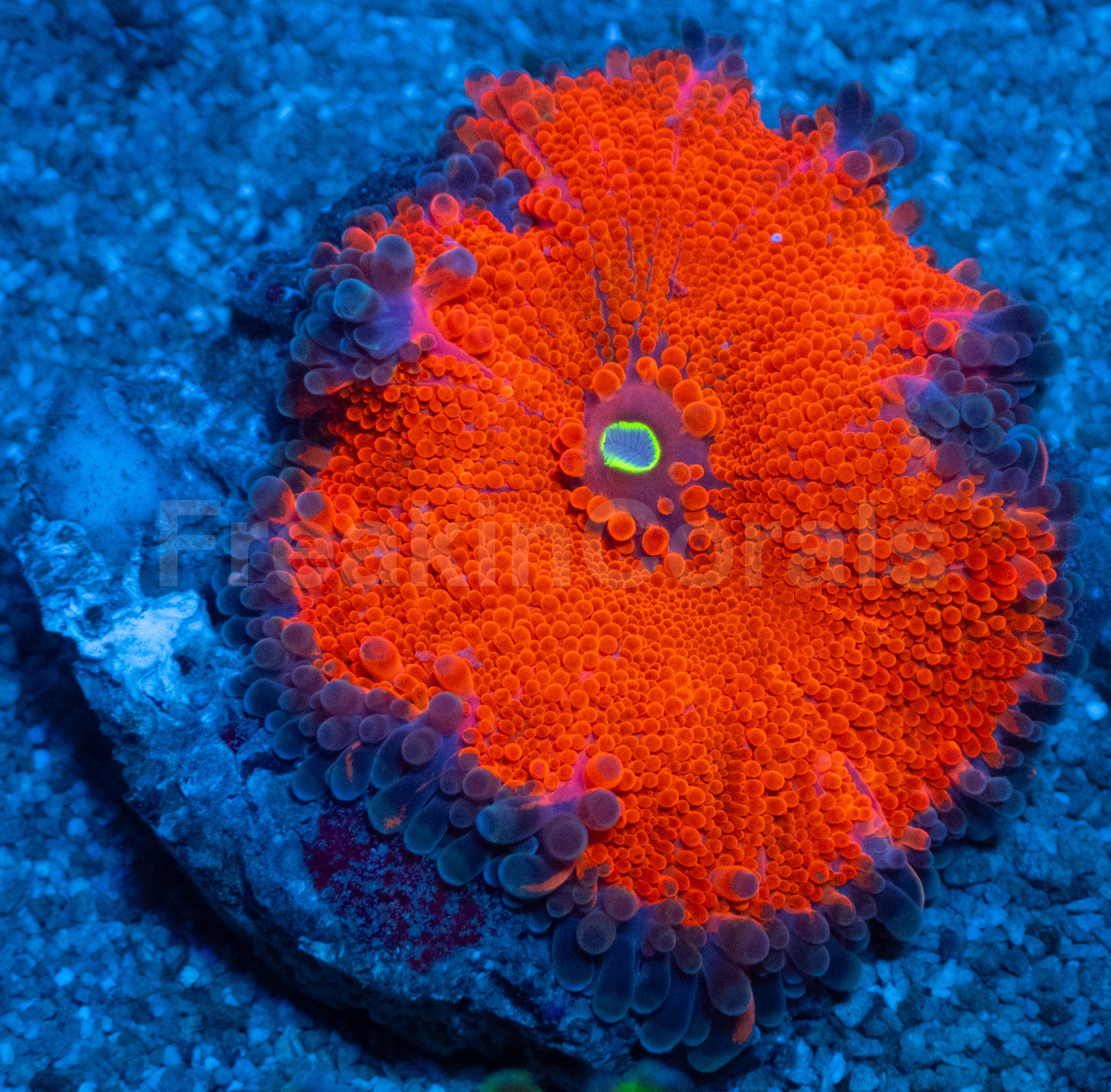Colour Form: A blazing orange body surrounded by an electric, midnight-blue rim โ the perfect contrast of fire and depth. The ultra-orange vesicles radiate vivid fluorescence, glowing like molten lava beneath actinic light, while the dark blue edge outlines each polyp with dramatic precision. Under blue or UV lighting, the coral erupts in neon brilliance, becoming a living ember framed in sapphire flame.