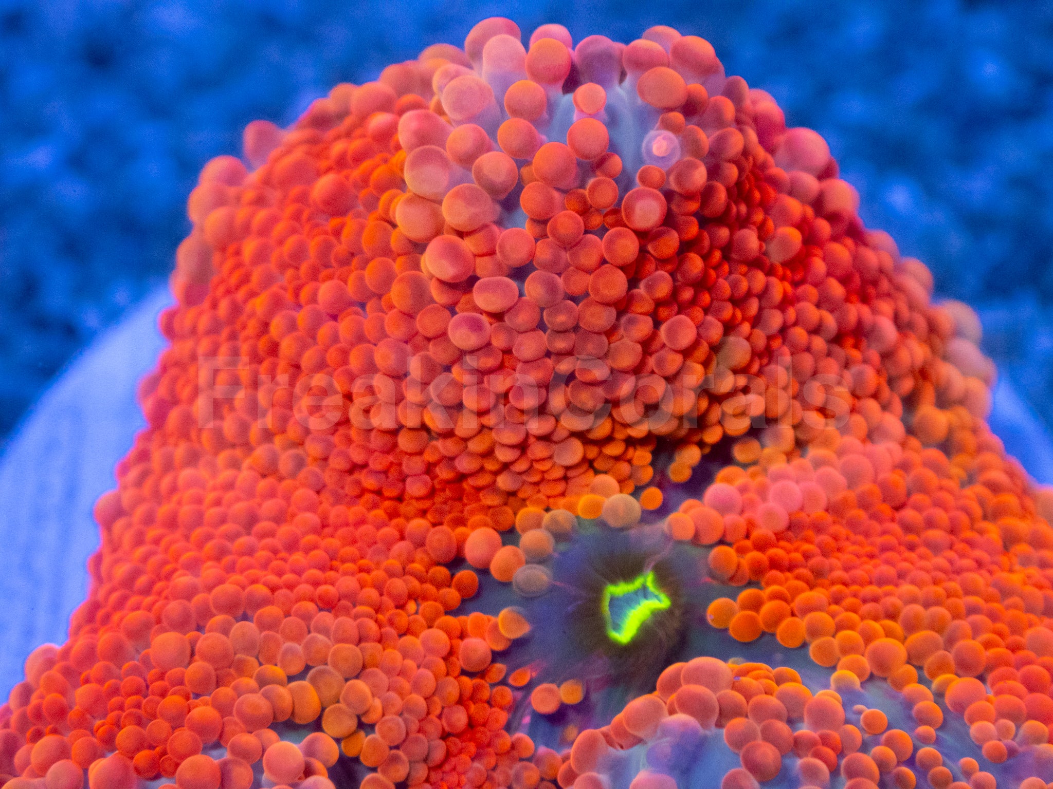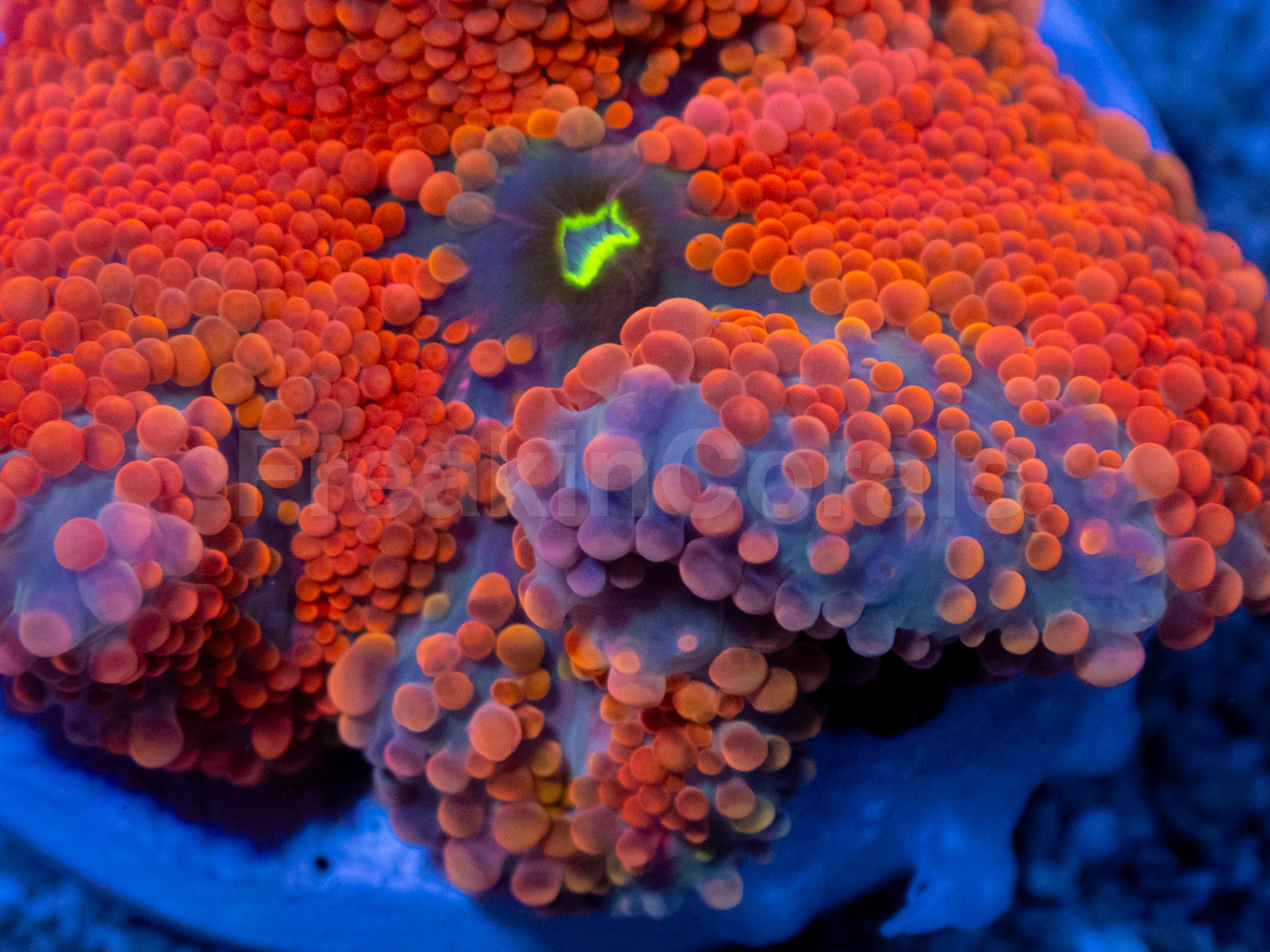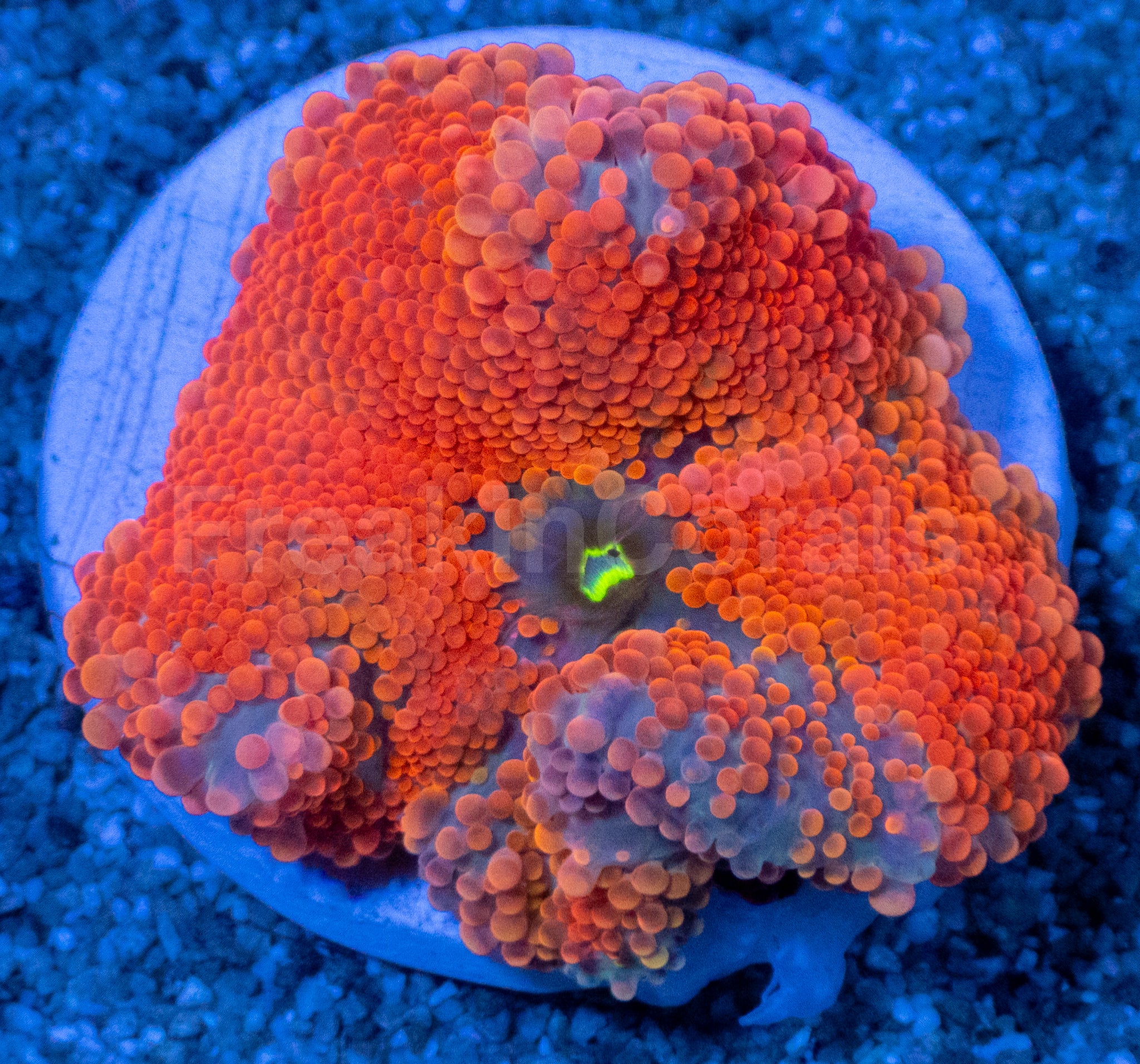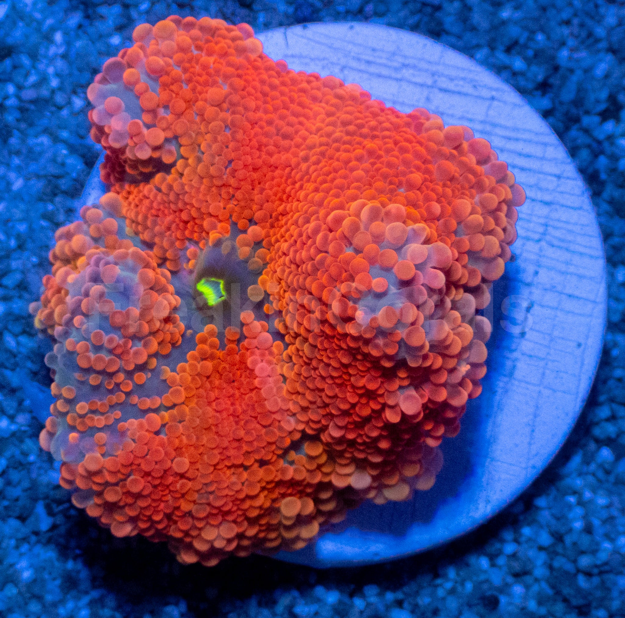 Colour Form: Blazing, ultra-saturated orange vesicles covering a thick, fleshy disc that glows like molten lava under actinic light. The entire polyp radiates neon warmth โ from its fiery centre to its outer rim โ producing an unmatched, retina-burning fluorescence. Under blue spectrum lighting, it becomes a living ember of pure reef fire.