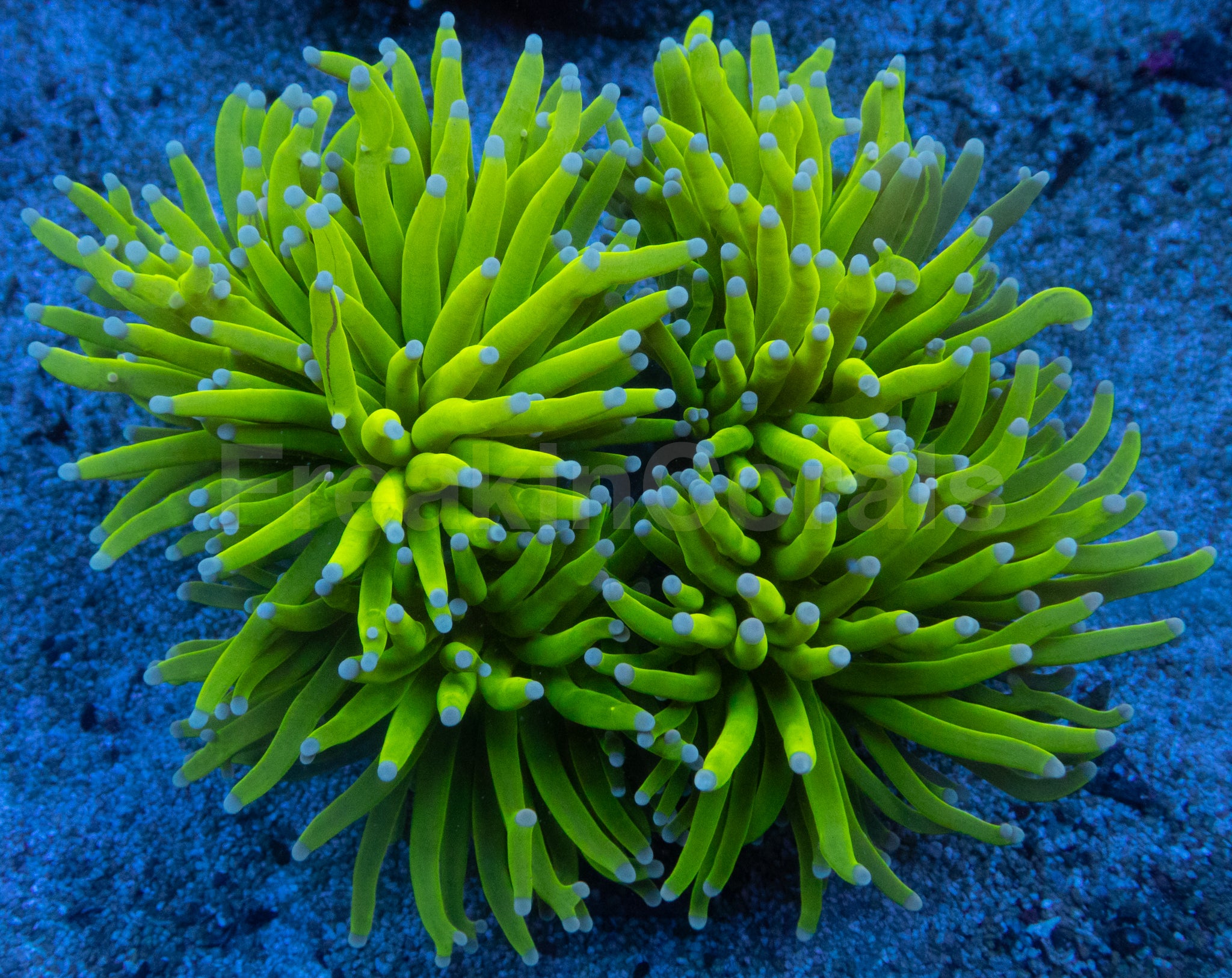 Colour Form: The Holy Grail Ghostfire Torch displays the iconic golden-yellow Holy Grail tentacles enhanced with rare bright white tips and subtle areas of natural grafting where different pigments blend across the tentacles. Under actinic lighting the golden body glows intensely while the white tips create a striking glowing crown effect. Under balanced white lighting the coral reveals rich shades of molten gold, warm yellow and creamy white highlights that give this torch an elegant and rare appearance.