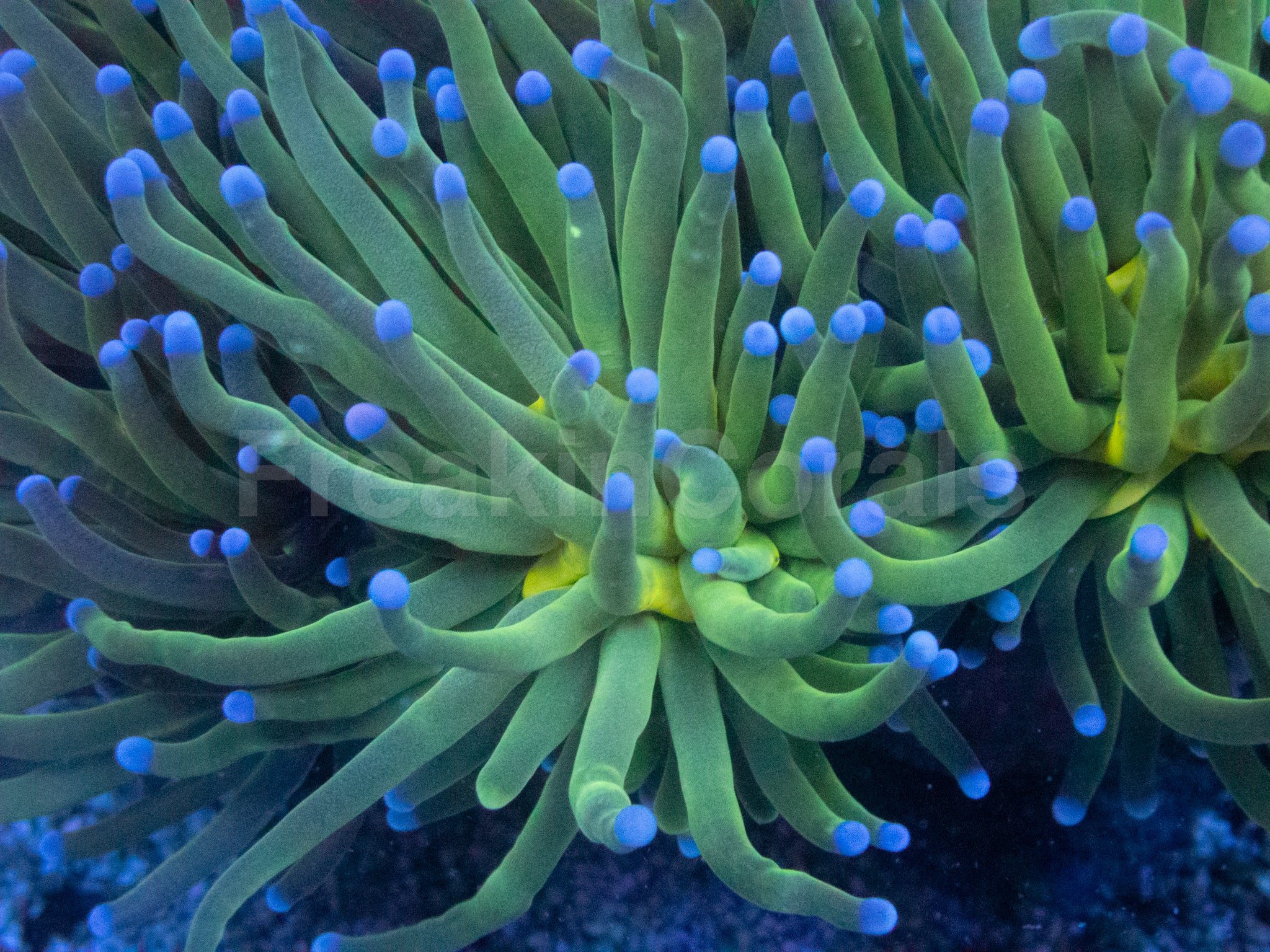 Glowing emerald tentacles crowned with electric-blue tips and a golden mouth — a vibrant torch frag that brings movement, contrast and collector-level colour to any reef aquarium.