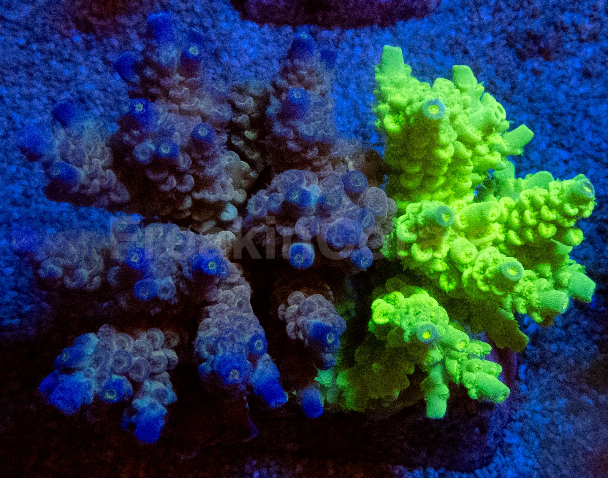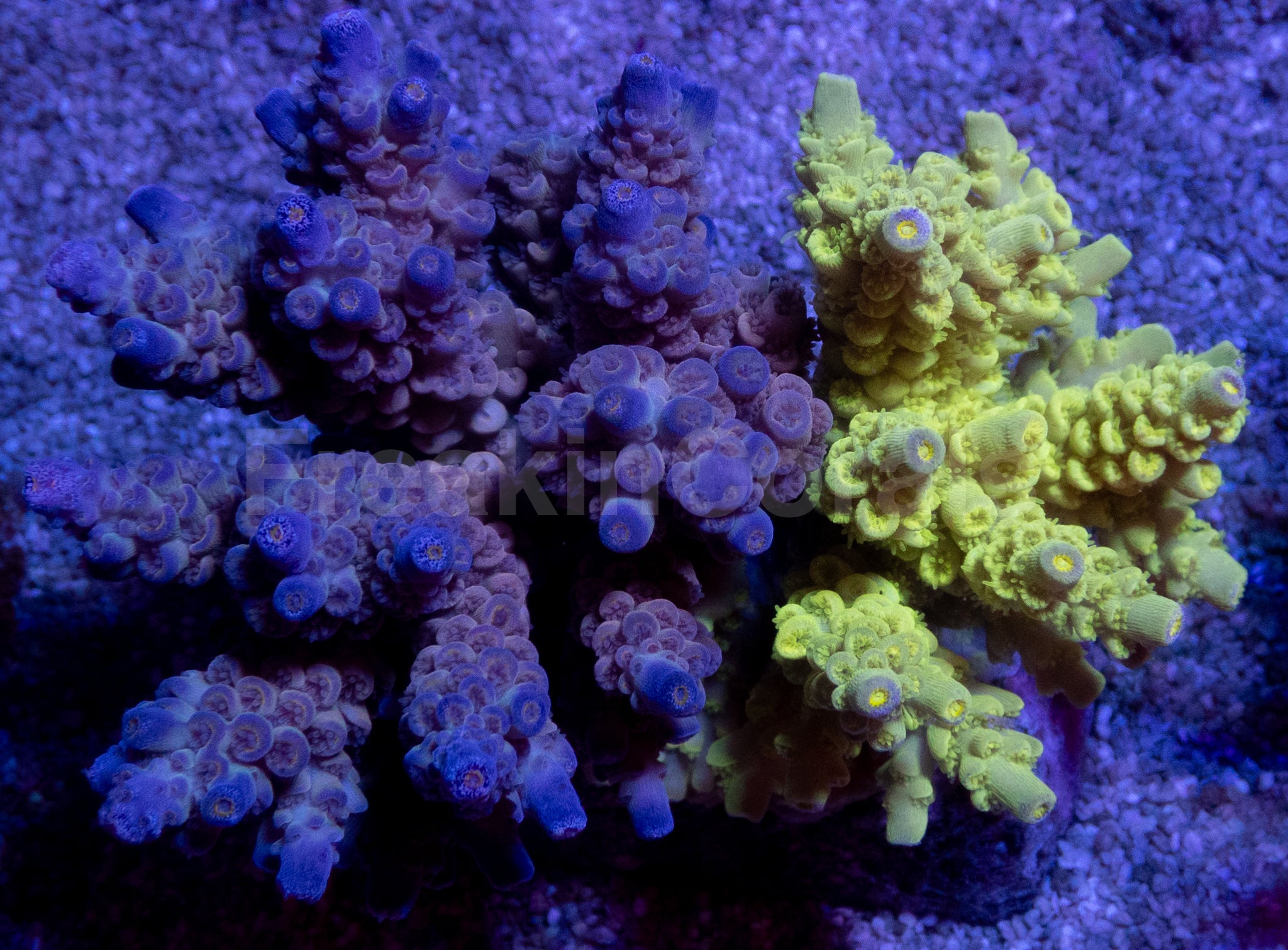 Acropora tenuis – Dual-Colour SPS Colony Combo Featuring Electric Blue & Toxic Yellow Morphs (Aquarium-Grown Colonies)