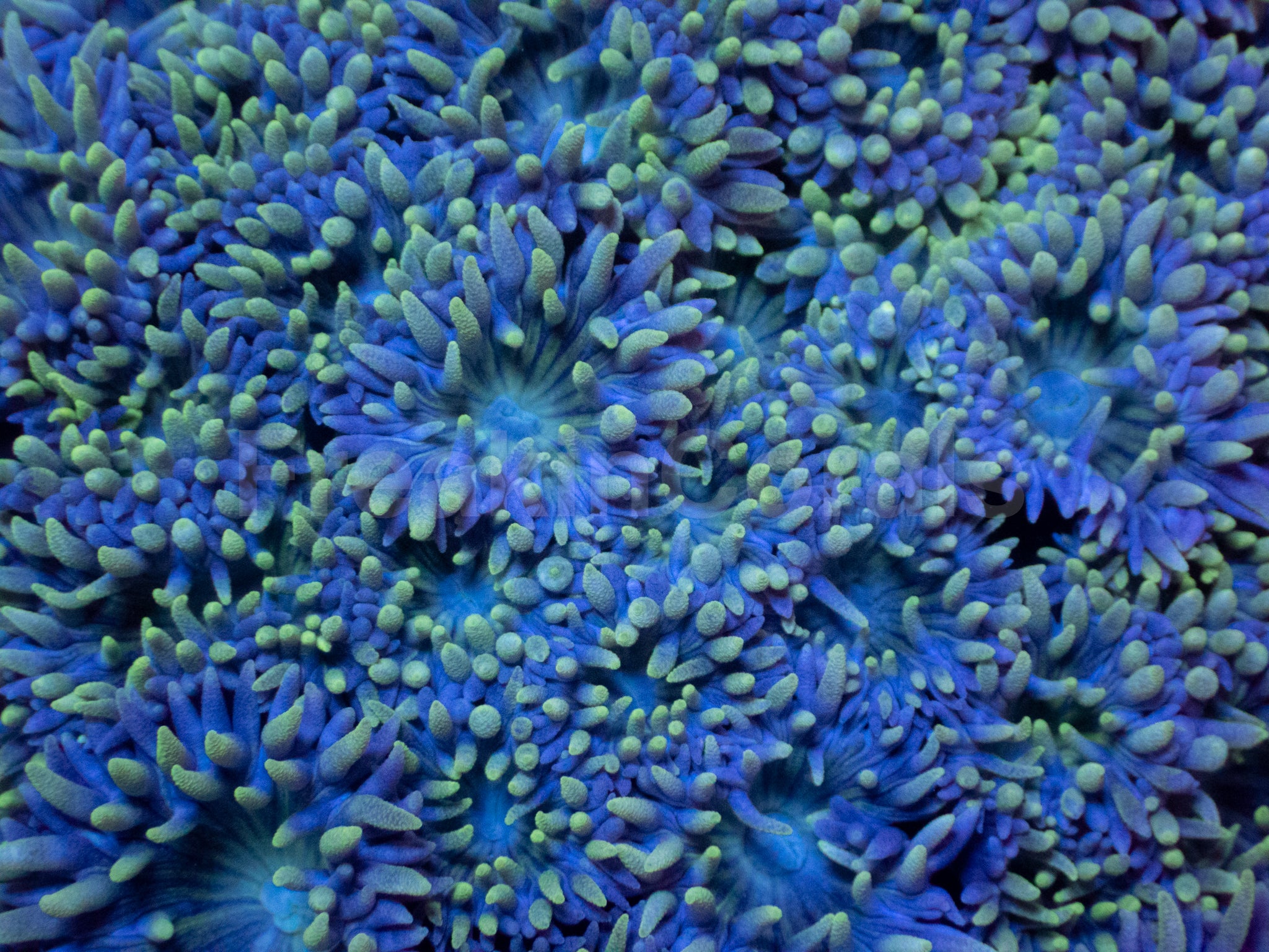 Colour Form: A classic, highly desirable Duncan coral featuring a rich green oral disc surrounded by long, flowing tentacles in soft mint to teal shades. Under actinic spectrum, the centre glows with vivid green fluorescence while the tentacles develop a subtle pastel shimmer. Known for its movement, responsiveness, and elegant polyp extension.
