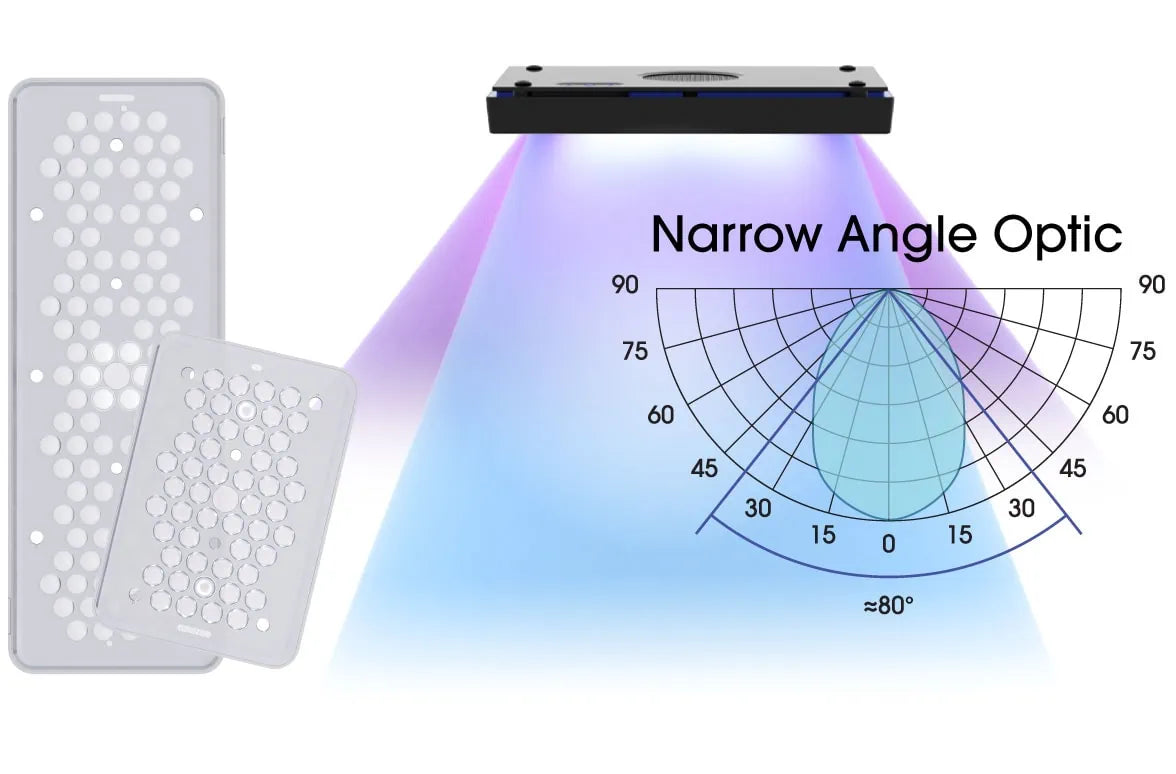 The Radion comes standard with wide-angle HEI optics, designed to maximize coverage while providing a balanced and well-integrated spectrum. For users seeking to maximize light intensity, the High Intensity Lens Kit (Narrow Angle) offers a significant increase in intensity (PAR) in exchange for reduced dispersion. The flexibility this accessory provides to the Radion can be particularly beneficial for users who install the lights further away from the aquarium, who seek greater light penetration into the aquarium, or who wish to improve efficiency when less dispersion is needed.