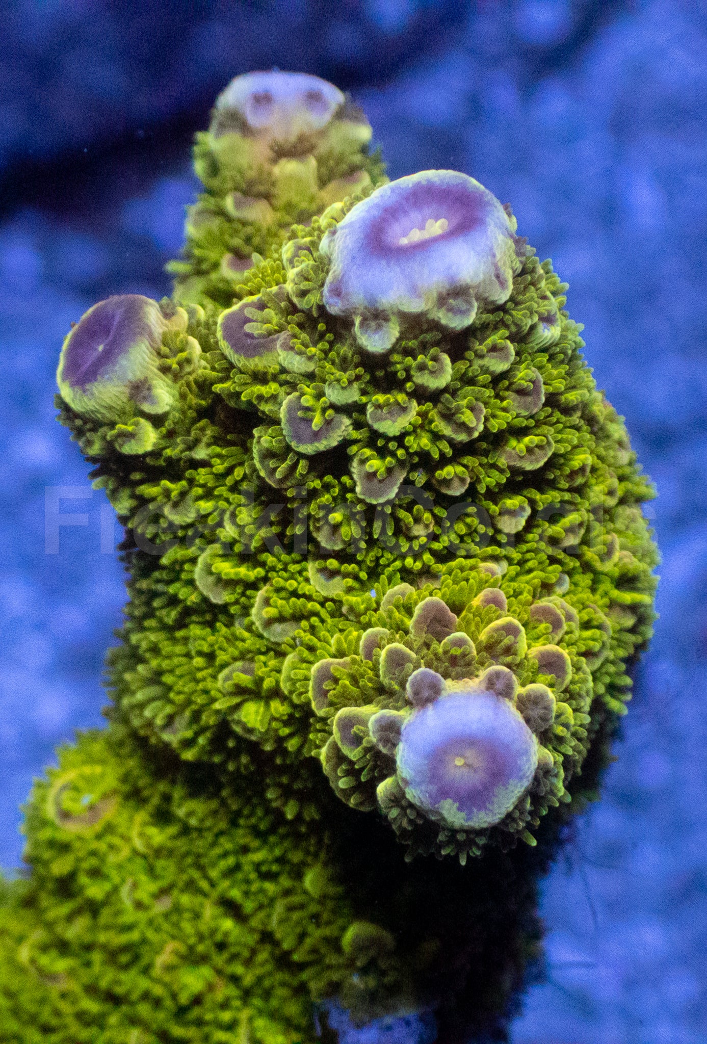 Branching is compact and spiky, with dense corallite structure and strong axial points. Under high light and flow, it develops thick, rigid branches with constant glowing tips, giving it that “charged” look 24/7.