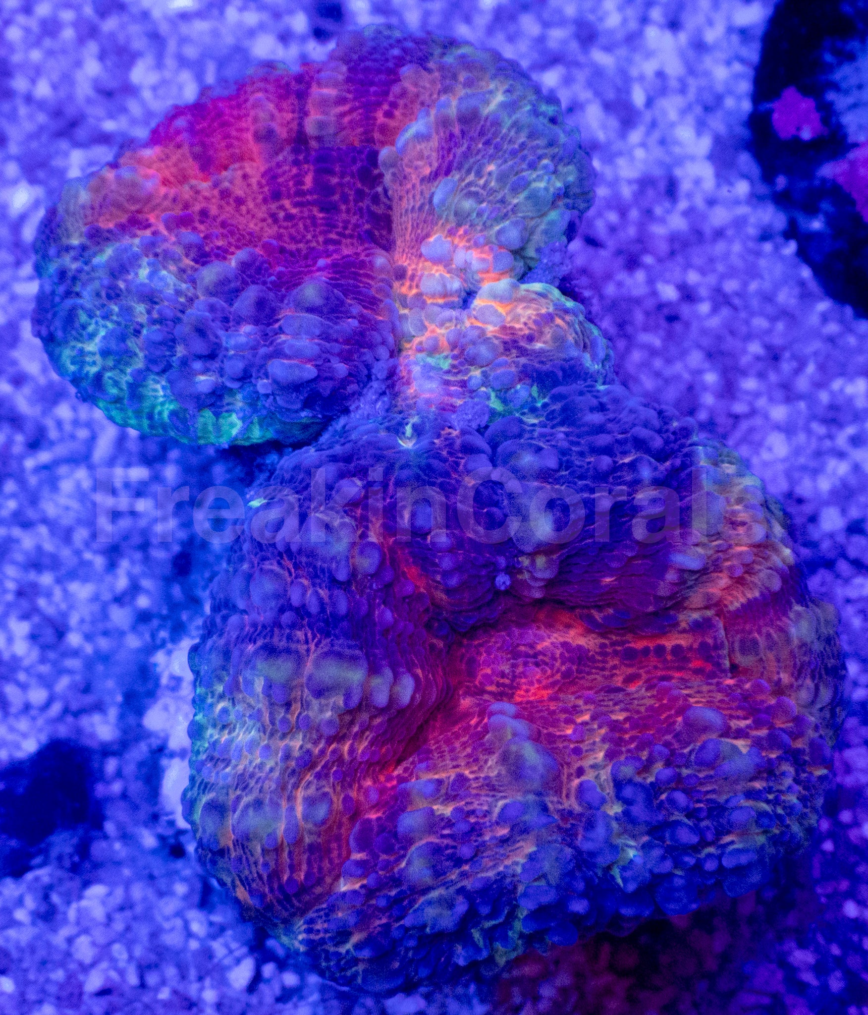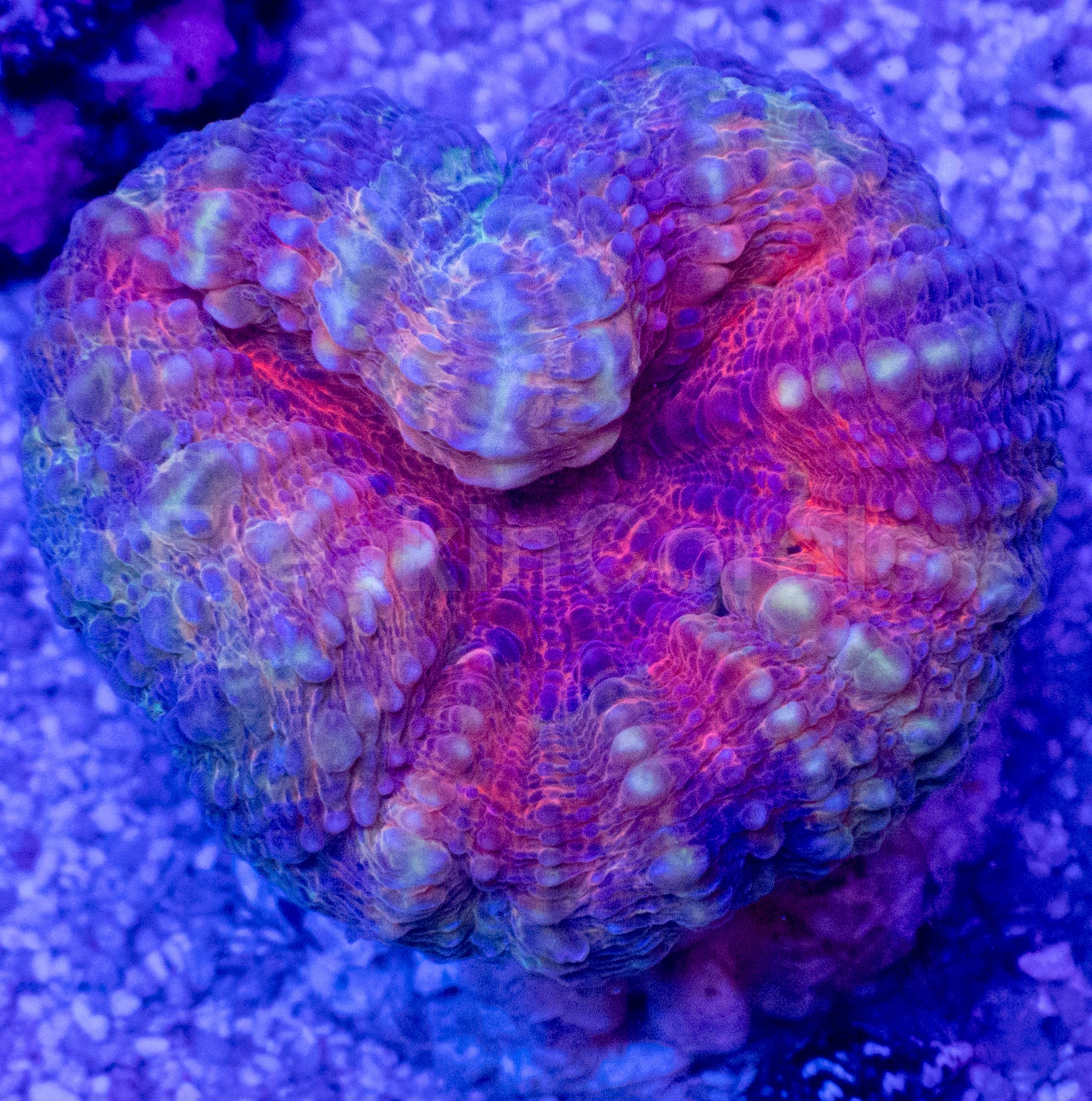 The Crocodile Aussie Lobophyllia is a unique coral with distinctive raised ridges and earthy fluorescent tones reminiscent of reptilian armour. This coral’s compact, sculpted form makes it an eye-catching addition for collectors seeking texture and colour depth in smaller spaces.