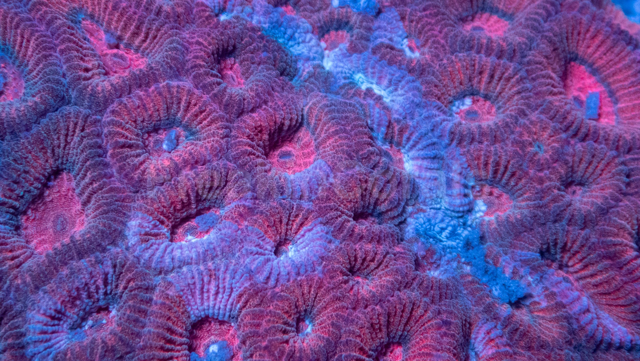 Colour Form: The “Cotton Candy Galaxy” morph displays a mesmerising mix of bubblegum pink valleys, lavender-purple ridges, and iridescent baby-blue streaks flowing across each polyp. Under daylight, the coral reveals pastel ribbons of colour with pearlescent depth; under actinic blues, it glows vividly with soft neon pink and icy blue luminescence — a truly cosmic palette that looks painted by hand.